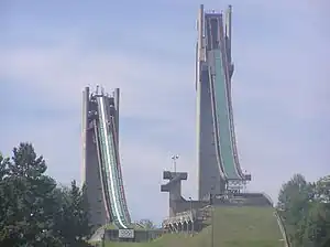 The Lake Placid Olympic Ski Jumping Complex, also known as the MacKenzie Intervale Ski Jumping Complex, consists of HS100- and HS128-meter ski jump towers built for the 1980 Olympic Games in Lake Placid, New York, United States. Modernized and lengthened in 2021, they are the only jumps in North America homologated for winter and summer jumping competitions.[1] The complex is operated by the Olympic Regional Development Authority.[2]