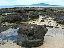 Other similar craters in the Auckland volcanic field were either buried by later eruptions, or breached by erosion as rainwater collected and overflowed the edge of the crater. Lake Pupuke remains a lake because, unlike the other vents, its eruptions produced substantial lava flows; water can thus escape through cracks in the lava reaching under the crater wall, creating a series of freshwater springs along the beaches between Takapuna and Milford. The lava flow at the end of Takapuna Beach enveloped a kauri forest, producing an internationally significant collection of tree moulds, which has been called "New Zealand’s only example of a fossil forest preserved in a lava flow" and which "ranks among the best examples in the world."[5] Some moulds have escaped burial by the boat ramp and car park built on top of the lava, and can be viewed at low tide.[6]
