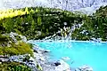 The strong turquoise color is dust from the glacier. The lake can only be reached by foot or by helicopter. The hiking trail has a length of 10.5 km[1] and takes 1.5 hours one way starting from Passo tre Croci.
