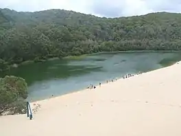 Lake Wabby is a small freshwater, green colored lake. It is located in the Great Sandy National Park on the eastern side of K'gari off the coast of Queensland, Australia. The lake is directly adjacent to the Hammerstone Sandblow,[1] which is slowly moving into the lake.[2] Eventually it will disappear under the sand.