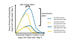 Primary and secondary consumers in lakes require organic matter (either from plants or animals) to maintain organismal function. Organic matter including tree leaves, dissolved organic matter, and algae provide essential resources to these consumers and in the process increase lake ecosystem respiration rates in the conversion of organic matter to cellular growth and organismal maintenance. Some sources of organic matter may impact the availability of other constituents. For example, dissolved organic matter often darkens lake water which reduces the amount of light available in the lake, thus reducing primary production. However, increases in organic matter loading to a lake can also increase nutrients that are associated with the organic matter, which can stimulate primary production and respiration. Increased dissolved organic matter loading can create tradeoffs between increasing light limitation and release from nutrient limitation. This tradeoff can create non-linear relationships between lake primary production and dissolved organic matter loading based on how much nutrients are associated with the organic matter and how quickly the dissolved organic matter blocks out light in the water column.[29][30][31][32] This is because at low dissolved organic matter concentrations as dissolved organic matter concentration increases, increased associated nutrients enhances GPP.[29][30][31] But as dissolved organic matter continues to increase, the reduction in light from the darkening of the lake water suppresses GPP as light becomes the limiting resource for primary productivity.[29][30][31] Differences in the magnitude and location of maximum GPP in response to increased DOC load are hypothesized to arise based on the ratio of DOC to nutrients coming into the lake as well as the effect of DOC on lake light climate.[31][33] The darkening of the lake water can also change thermal regimes within the lake as darker waters typically mean that warmer waters remain at the top of the lake while cooler waters are at the bottom. This change in heat energy distribution can impact the rates of pelagic and benthic productivity (see Temperature above), and change water column stability, with impacts on vertical distribution of nutrients, therefore having effects on vertical distribution of metabolic rates.