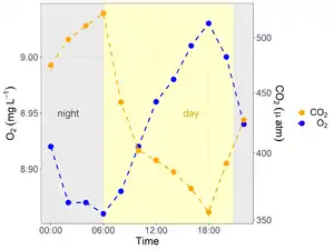 On a daily scale, GPP rates are most affected by the diel cycle of photosynthetically active radiation while ER is largely affected by changes in water temperature.[50] Additionally, ER rates are also tied to the quantity or quality of the organic substrate and relative contributions of autotrophic and heterotrophic respiration, as indicated by studies of the patterns of night-time respiration (e.g. Sadro et al. 2014[10]). For example, bacterioplankton respiration can be higher during the day and in the first hours of the night, due to the higher availability of labile dissolved organic matter produced by phytoplankton. As the sun rises, there is a rapid increase in primary production in the lake, often making it autotrophic (NEP > 0) and reducing dissolved CO2 that was produced from carbon mineralization that occurred during the night. This behavior continues until reaching a peak in NEP, typically around the maximum light availability. Then there is a tendency for the NEP to fall steadily between the hours of maximum light availability until the next day's sunrise.