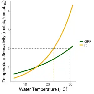 Temperature is a strong controlling factor on biochemical reaction rates and biological activity. Optimal temperature varies across aquatic organisms as some organisms are more cold-adapted while others prefer warmer habitats. There are rare cases of extreme thermal tolerance in hypersaline antarctic lakes (e.g. Don Juan Pond) or hot springs (e.g. Fly Geyser); however, most lake organisms on Earth reside in temperatures ranging from 0 to 40 °C. Metabolic rates typically scale exponentially with temperature, however, the activation energy for primary productivity and respiration often differ, with photosynthesis having a lower activation energy than aerobic respiration. These differences in activation energies could have implications for net metabolic balance within lake ecosystems as the climate warms. For example, Scharfenberger et al. (2019)[20] show that increasing water temperature resulting from climate change could switch lakes from being net autotrophic to heterotrophic due to differences in activation energy, however, the temperature at which they switch depends on the amount of nutrients available.
