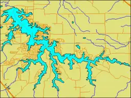![]() Map - the lake's irregular shape reveals its origins as a dammed river amidst hilly terrain. | |