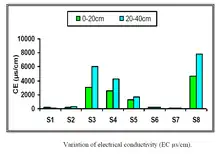 The previous studies show that the salinity is particularly important in the north, in the east and in the southeast of Fetzara Lake. The West and the center of the lake seems to be the areas slightly affected by salts due to movement of salts towards the periphery with desalination of the center Lake [7]. The Average of electrical conductivity of soil solution in the lake is about 1534 μs/cm for the layer 0–20 cm, and 2577 μs/cm for the other layer 20–40 cm, indicating a very large variation between the two layers with a high concentration of soluble salts in depth.