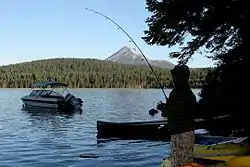 Today, the Oregon Department of Fish and Wildlife manages the Lake of the Woods fishery. The agency has used both natural production and stocking to maintain and balance the fish populations. Brook trout, black crappie, brown bullheads, yellow perch, largemouth bass, blue chub, and tui chub have self-sustaining populations, while the kokanee salmon, brown trout, and rainbow trout populations are supplemented by stocking.[7] The kokanee salmon caught in Lake of the Woods average 12 inches (300 mm); the brown trout average 14 inches (360 mm) to 19 inches (480 mm); and most rainbow trout are about 10 inches (250 mm), but a few reach up to 2 pounds.[13]
