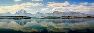 At its formation in 1929, Grand Teton National Park encompassed just six main lakes at the foot of the park's major peaks, but with the expansion of the park there are now 44 named lakes[1] within the boundary, and countless smaller unnamed lakes and ponds. The peaks were raised in relatively recent geological time and carved by glaciers in the ica age. Most of the lakes in the park were formed by glaciers, which carved out the valleys they sit in, and where glacial morraine formed the dams that created the lakes. The largest lakes are still found at the base of the Teton Range.[2] In the northern section of the park lies Jackson Lake, the largest lake in the park at 15 mi (24 km) in length, 5 mi (8.0 km) wide and 438 ft (134 m) deep.[3] Though Jackson Lake is natural, the Jackson Lake Dam was constructed at its outlet before the creation of the park, and the lake level was raised almost 40 ft (12 m) consequently.[4] East of the Jackson Lake Lodge lies Emma Matilda and Two Ocean Lakes. South of Jackson Lake, Leigh, Jenny, Bradley, Taggart and Phelps Lakes rest at the outlets of the canyons which lead into the Teton Range. Within the Teton Range, small alpine lakes in cirques are common, and there are more than 100 scattered throughout the high country.[5] Lake Solitude, located at an elevation of 9,035 ft (2,754 m), is in a cirque at the head of the North Fork of Cascade Canyon. Other high-altitude lakes can be found at over 10,000 ft (3,000 m) in elevation and a few, such as Icefloe Lake, remain ice-clogged for much of the year.[6] The park is not noted for large waterfalls; however, 100-foot-high (30 m) Hidden Falls just west of Jenny Lake is easy to reach after a short hike.[7]