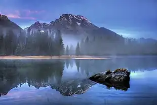 Taggart lake was named after William Rush Taggart, an assistant surveyor to Frank Bradley as part of the Snake River division of the Hayden expedition of 1872 to document the geology and topography of the Yellowstone area.[34] It is a touch lower than Bradley lake, at an elevation of 6,902 ft (2,104 m). The lake is .45 mi (0.72 km) long and .40 mi (0.64 km) wide with a maximum depth of 80 ft (24 m).[8]