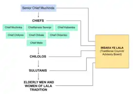 Separate from this hierarchy is the traditional council, referred to as 'Insaka ye Lala'. It is an independent institution constructed to be an advisor to chiefs and other Lala community groups. According to Buckle in his 1976 manuscript on David Livingstone, he attests to the existence of chiefs and headmen among the Lala in Livingstone's time.[4]
