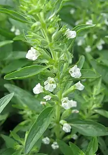 This plant is an annual herb growing to an average height around 40 cm (16 in). The toothed or serrated leaves are in opposite pairs at the stem nodes. Inflorescences emerge from the leaf axils and bear white, lipped flowers each about 1 cm (0.4 in) long. They are pollinated by insects.[1]