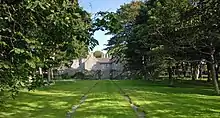 St. Columba is reputed to have established a monastic settlement on Lambay c. 530 AD, which passed to Colman and a line of successor abbots and at least one bishop. The religious settlement was raided by Vikings in 795, resulting in the church and buildings being ransacked and burned.[34] Surveys in the early 20th century found remains of an enclosure to the south of the present chapel, and these, and modern satellite photography, suggested it was a moated site.