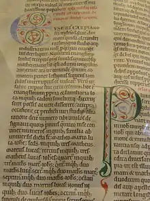 The style of the illumination is clearly influenced by the work of Master Hugo, the illuminator of the Bury Bible. The Lambeth Bible bears close stylistic resemblance to the Gospel Book made for Abbot Wedric of Liessies Abbey (Hainault) in 1146, of which only two leaves survive (the rest having been destroyed at Metz in World War II), now in Avesnes-sur-Helpe.[1] Eric Millar proposed a Canterbury provenance, which C. R. Dodwell supported in his study of the Canterbury scriptorium of 1954.[2] More recently, Josef Reidmaier argued that the manuscript was produced in the Christ Church scriptorium around 1150.[3] Dorothy Shepard argues that the book was produced in the scriptorium of St Augustine's Abbey between 1150-70.[4] However, none of the divisions of the two-volume Bibles included in the inventory of the St Augustine’s library correspond to that of the Lambeth Bible. Christopher de Hamel instead links the Bible to Faversham Abbey, and claims that it was being produced for King Stephen. He supports his claim by drawing attention to the frequent royal imagery in the Bible, and the short period between 1146 (when the illuminator was in France) and 1154 (King Stephen's death) as an explanation for the Bible's incomplete state.