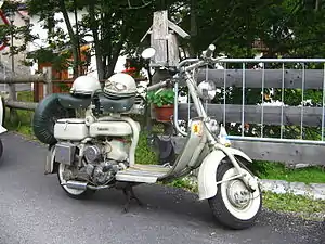 The 123cc engine and transmission was upgraded and simplified in an attempt to improve reliability as well as improving the ride of the scooter.[2] The top end kept the same construction with the cylinder made of cast iron and head aluminium but the cooling system was enlarged to make the bike more reliable in heat and under strain.[3] The new Carburetor was a Dell'Orto MA18. The transmission provided by a 3-speed gearbox and was shaft driven. The exhaust was revised to reduce noise and vibration.[2] In 1954 due to demand from the public, for a larger engine, the Model D150 was announced with a 148cc engine. The overall top speed was improved slightly but the main area of improvement was in torque and gear ratios to make the ride smoother and to help the scooter make it up mountain passes.[6]