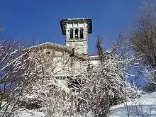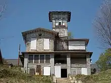 The house is a two-story frame structure in the Italian Villa style. It features a three-story tower, bracketed eaves, tall windows, and quoins on the corners. It is unknown who painted the three-story fresco in the central staircase.[8] It was painted using the trompe l'oeil style that makes the walls look like white marble with inset panels of green marble that are trimmed with wood molding. The porches added in 1925 have been removed and two small porches and a balcony have been restored. The roof is composed of a synthetic slate. A two-story addition was built onto the back house, and it has been rebuilt in the 21st-century restoration. A two-car garage that is architecturally compatible with the house was built into the hillside next to the house.