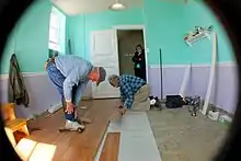 Laminate floors are reasonably easy for a DIY homeowner to install. Laminate flooring is packaged as a number of tongue and groove planks, which can be clicked into one another. Sometimes a glue backing is provided for ease of installation. Installed laminate floors typically "float" over the sub-floor on top of a foam/film underlayment, which provides moisture- and sound-reducing properties. A small (1–10 millimetres (0.039–0.394 in)) gap is required between the flooring and any immovable object such as walls, this allows the flooring to expand without being obstructed. Baseboards (skirting boards) can be removed and then reinstalled after laying of the flooring is complete for a neater finish, or the baseboard can be left in place with the flooring butted into it, then small beading trims such as shoe moulding or the larger quarter-round moulding can be fitted to the bottoms of the baseboards. Saw cuts on the planks are usually required at edges and around cupboard and door entrances, but professional installers typically use door jamb undercut saws to cut out a space to a height that allows the flooring to go under the door jamb & casing for a cleaner look.