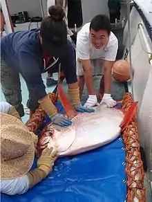 In May 2015, L. guttatus was shown to maintain its entire body core above ambient temperature, becoming the first known fish with this trait ('whole-body endothermy').[8][9] The fish generates heat as well as propulsion with continuous movements of its pectoral fins (the musculature of which is insulated by a one-cm-thick layer of fat), and the vasculature of its gill tissue is arranged to conserve heat by a process of countercurrent heat exchange, a structure known as a rete mirabile (plural, retia).[8][10] It can consistently keep its body core approximately 5 °C warmer than its environment.[9] Elevated body core temperature should improve aerobic performance and physiologic function. Other adaptions of L. guttatus to increase aerobic performance include high hematocrit and a relatively large heart, gill surface area and aerobic muscle mass. These adaptations for high performance predation are similar to those found in tuna and lamnid sharks, which actively chase down their prey, but are very unusual among lampridiform fish, which are mostly sluggish ambush predators.[8]