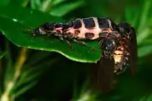 The eggs hatch after two or three weeks, possibly longer in colder climates.[6] Larvae and adult females look similar, but larvae have bright spots on each of 12 segments, whereas adult females have a completely black back.