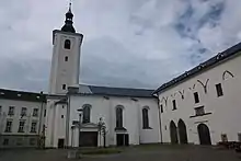 The original monastery from the 14th century was rebuilt into a Renaissance castle. The reconstruction was completed in 1601. From the 1650s to 1716, it was rebuilt to its current appearance. Today it houses the town museum.[10] The Church of Saint Wenceslaus is adjacent to the castle and stood here before the founding of the monastery. It was first mentioned in 1350 and originally was consecrated to the Virgin Mary. It was reconstructed several times; the tower was added in 1768.[11]
