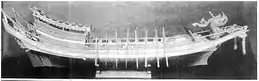 Lancang have overhanging square sterns above a sharp waterline stern.[1]: 579 Lancang usually have 2 masts, but single and tri-masted vessels are also recorded.[1]: 579 Historically they were steered using double quarter rudders, but in the 18th century they also used axial rudders mounted at the sternpost.[7]: 254 The smallest lancang were 5 depa (9.1 m) long, with a 1 depa (1.8 m) beam, draft of 1.5 ft (46 cm), and a 4 ft (1.2 m) freeboard. These smaller boats could carry cargo of around 5 pikul (312.5 kg) and were crewed by 4 men,[1]: 583 while the largest may have reached about 26 m long, based on the Sambirejo shipwreck.[3]: 261 Lancang from older era is rigged using tanja sails, but dipping lug sails or fore-and-aft sails are used after the arrival of the European. Lancang has "clipper" bow, with triangular fore-gallery for anchor, which also acts as bowsprit. Headsails may be used at the bow. The hull is carvel-built, built with style very similar to European ships. They are usually armed with pivot guns.[1]: 579