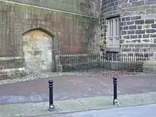 In 1554, the martyr George Marsh was held at the castle before standing trial at Chester Cathedral.[23] Some Quakers, including in 1660 George Fox, were held at the castle for being politically dangerous.[19] County gaols, such as this one, were intended to hold prisoners for short periods immediately before trial. The castle also served as a debtors' prison. In the 18th century it became more common for county gaols to hold longer-term prisoners; as a result they began to suffer from overcrowding.[24]