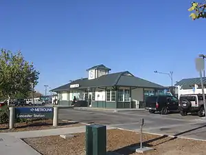 Lancaster station is served by 18 Metrolink Antelope Valley Line trains (9 in each direction) each weekday running primarily at peak hours in the peak direction of travel. Weekend service consists of 12 trains (6 in each direction) on both Saturday and Sunday evenly spaced throughout the day.[3]