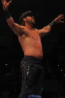 Hoyt began developing a strong fan following, leading to his introducing a gimmick known as "Hoytamania", a reference to the "Hulkamania" surrounding Hulk Hogan.[3] He feuded with Team Canada throughout mid-2005, and lost to Abyss at Sacrifice.[13] He lost to Monty Brown at Bound for Glory[14] and was involved in the 10-man Gauntlet match later in the night to determine the number one contender for Jeff Jarrett's NWA World Heavyweight Championship.[14] In that match, Hoyt was eliminated by eventual winner Rhino.[14] He later began teaming with Matt Bentley in mid-card tag matches until a misinterpreted steel chair incident led Bentley to believe Hoyt had "screwed" him, and he severely turned on him with a spontaneous brawl by ringside, consisting of several chairshots. Hoyt defeated Bentley at Destination X.[15] He returned to TNA at No Surrender in the Triple Chance Tag Team battle royal as a partner to Ron "The Truth" Killings, but he was one of the first eliminated from the match.[16] Hoyt made his Spike TV return, teaming with Killings to defeat Matt Bentley and Kazarian.