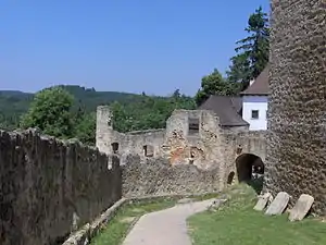 Landštejn Castle is a 13th-century castle in Staré Město pod Landštejnem in Jindřichův Hradec District in the South Bohemian Region of the Czech Republic. The first written record of the castle is from 1231, at which time it was the largest Romanesque castle in the Czech lands. It is one of the oldest and best preserved such structures in Europe. The two large towers are connected by a wall defining the upper castle and its courtyard. The six-story southern tower is the main tower and is fully preserved, including a gate in the western wall.