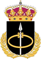 The coat of the arms of the Land Warfare Centre used from 1999. Blazon: "Sable, a spear issuant argent surmounted by an old arm bracelet or. The shield surrounded by an open wreath of laurel or".[14]