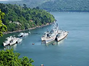 A naval station was first set up here around 1840 to house reserve fleet vessels and their crews (totalling nearly 200 sailors), and it was visited by Napoleon III and empress Eugénie during their August 1858 trip into Brittany. During the Second World War the base was used by the German occupiers such as the school ship Armorique (sabotaged in August 1944). Post-war, the ship moved from a base for reserve ships kept in readiness to disarmed naval ships left here for other purposes. Other disarmed French ships have been used as breakwaters before the château de Brest or as training ships off the naval school at Lanvéoc-Poulmic, but those at Landévennec await demolition or use for target practice in naval exercises at sea. Despite requests from Landévennec's mayor, the aircraft carrier Clemenceau was not retired to the base, with the Capelan bank apparently discouraging pilots from attempting to navigate it into the base. However, having been emptied of nearly all its occupants, in August 2006 the graveyard took on three former breakwaters which would become Brest's "port du Château" and had been moved to allow expansion work to begin. The cruiser Colbert and the Soviet-built hydrofoil ferry Kometa from the Penn-ar-Bed company (which provided summer services to Ushant) are now also based here.