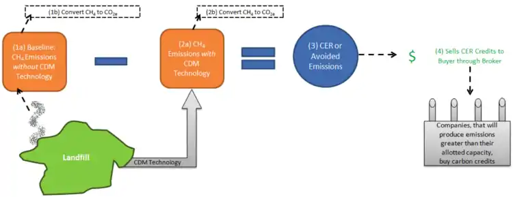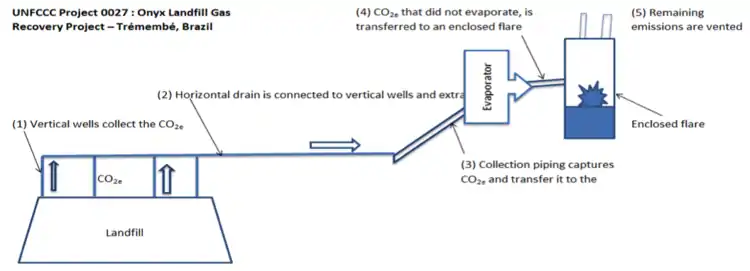 Private companies have submitted CDM projects to the United Nations Framework Convention on Climate Change (UNFCCC) to use landfill gas (LFG) discharges from waste management sites to earn carbon credits or CER. There are over 100 LFG CDM projects in Brazil.[3] The diagram below illustrates the process.[6]