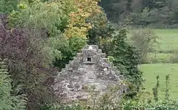 A walled garden with several associated greenhouses dating from at least the 1850s is located to the east of the mansion house and has a late 18th-century over its entrance.[29] The 1856 OS map indicates a Summer House and bowling green located on the east side of the walled garden.[17]