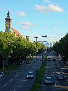 The Landshuter Allee is an avenue in Munich and through most of its course it is part of the Mittlerer Ring, the Bundesstraße 2 R. It joins Donnersbergerbrücke at Arnulfstraße in the Neuhausen district and runs from Dachauer Straße west of the Olympiapark to Moosacher Straße west of the Olympic village in the Moosach district. The B 2R leaves the intersection-free avenue at the Landshuter Allee and continues on the Georg-Brauchle-Ring. The Landshuter Allee now functions as the B 304 and connects the Mittlerer Ring with the northern tangent of the Outer Ring, which is only partially complete. The large width of the Landshuter Allee of 54 metres between the houses is striking.[1] It crosses the Nymphenburg-Biedersteiner Kanal.