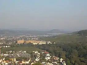 ![]() View from Langer Köbes viewing tower on the Neuenahrer Berg looking northeast over the Ahr Viaduct on the A 61 to the Landskrone