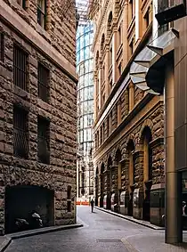 Wynyard Lane allows vehicle access to structures on George and Carrington Streets. Manning Lane goes through Bridge and Dalley Street, where it provides a shortcut through the building midway between George and Pitt Street. Phillip Lane allows vehicle entry to buildings on Phillip Street and Macquarie Street. Sussex Lane is parallel to Kent Street and is characterised by several terraced stores, in addition to featuring Waterside Workers' Federation Building, a heritage listed edifice. York Lane is a crucial laneway that provides access to heritage building sites and as well as access for vehicles and pedestrians. James Lane represents a number of 19th century industrial-style buildings, and it still maintains its original form. Rawson Lane near Pitt Street features heritage buildings and a view of the clock tower at the Central railway station.[6]