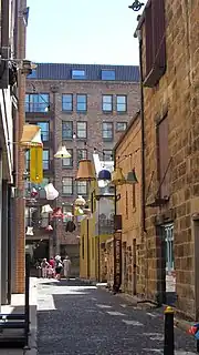 The lanes and alleyways of Sydney are a series of passageways found in Sydney central business district that have historically functioned by providing both off-street vehicular access to city buildings and secondary pedestrian routes through city blocks. They generally feature street art, cafes, restaurants, bars and retail outlets.[1] The Rocks has the most prominent and historical laneways in Sydney, which date to the 19th century.[2] Forgotten Songs is a popular attraction found in Angel Place.[3]
