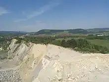 The Langenberg chalk quarry exposes a nearly continuous, 203 m (666 ft) thick succession of carbonate rocks[1] belonging to the Süntel Formation, that ranges in age from the early Oxfordian to late Kimmeridgian stages and have been deposited in a shallow sea with a water depth of less than 30 m (98 ft). The layers exposed in the quarry are oriented nearly vertically and slightly overturned, which is a result of the ascent of the adjacent Harz mountains during the Lower Cretaceous. Widely known as a classical exposure among geologists, the quarry had been extensively studied, and visited by students of geology for decades.