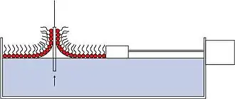 In a later paper Pockels examined the effects of different ratios of hydrophobic to amphiphilic molecules on surface tension and monolayer formation.[11] After the turn of the century, Pockels's trough was improved upon by Irving Langmuir. With this new device Langmuir showed that amphiphillic films are truly monolayers, and these monolayers are oriented on the surface such that the "active or most hydrophilic portion of the surface molecules are in contact with the liquid below whereas the hydrophobic portions of the molecules are pointing up toward the air".[12] William Harkins described similar results at the same time.[13] Shortly after Langmuir described the transfer of amphiphilic films from water surfaces to solid surfaces (Langmuir, 1920). Langmuir won the Nobel prize in chemistry for this work in 1932.[3]