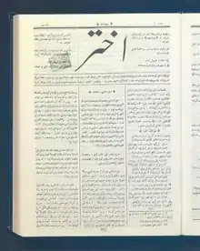 Several provincial newspapers (vilayet gazeteleri in Turkish) were in Arabic.[25] The first Arabic language newspaper published in the Arab area of the empire was Ḥadīqat al-Akhbār, described by Strauss, also author of "Language and power in the late Ottoman Empire," as "semi-official".[27] Published by Khalīl al-Khūrī (1836–1907), it began in 1858.[28] There was a French edition with the title Hadikat-el-Akhbar. Journal de Syrie et Liban.[29] Others include the Tunis-based Al-Rāʾid at-Tūnisī and a bilingual Ottoman Turkish-Arabic paper in Iraq, Zevra/al-Zawrāʾ; the former was established in 1860 and the latter in 1869. Strauss said the latter had "the highest prestige, at least for a while" of the provincial Arabic newspapers.[30]