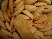 Cat's tongue cookies are sweet and crunchy.[1] The original recipe most likely comes from 17th century France.[5][6][7] They are produced from egg white, wheat flour, sugar, butter (sometimes) and vanilla.[8] They are baked in the oven until cooked.[4] Additional ingredients may include chocolate, citrus, and spices.[1]