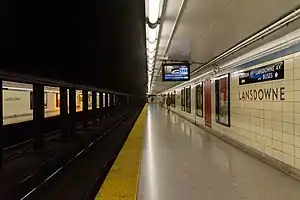 Lansdowne is a subway station on Line 2 Bloor–Danforth of the Toronto subway in Toronto, Ontario, Canada. The main station entrance is located just north of Bloor Street on Lansdowne Avenue, with a secondary unstaffed entrance on Emerson Avenue. Opened in 1966, the station lies approximately 561 metres (1,842 feet) from its nearest station to the west, Dundas West.[2] The station is in the Dovercourt-Wallace Emerson-Junction neighbourhood on the edge of the Bloordale Village strip. Wi-Fi service is available at this station.[3]