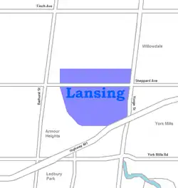 Lansing is a neighbourhood in Toronto, Ontario, Canada. It originated as a minor settlement of a store, other services and a post office at the corner of Yonge Street and Sheppard Avenue and later got consolidated with Toronto as sprawling development took place. A larger area was designated as the postal village of Lansing. The City of Toronto labels it as Lansing-Westgate for neighbourhood planning purposes with the boundaries Yonge Street to the east, Highway 401 to the south, Bathurst Street to the west and Burnett Avenue to the north.