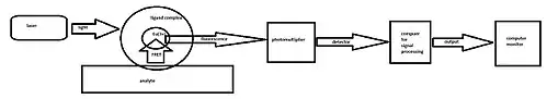 There are two main assaying techniques: heterogeneous and homogeneous. If two lanthanide chelates are used in the analysis one after the other—it is called heterogeneous assaying.[4] The first analyte is linked to a specific binding agent on a solid support such as a polymer and then another reaction couples the first poorly luminescent lanthanide complex with a new better one.[1][4] This tedious method is used because the second more luminescent compound would not bind without the first analyte already present. Subsequent time resolved detection of the metal-centered luminescent probe yields the desired signal. Antigens, steroids and hormones are routinely assayed with heterogeneous techniques. Homogeneous assays rely on direct coupling of the lanthanide label with an organic acceptor.[1]