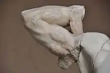 When the statue was discovered, Laocoön's right arm was missing, along with part of the hand of one child and the right arm of the other, and various sections of the snake. The older son, on the right, was detached from the other two figures.[40] The age of the altar used as a seat by Laocoön remains uncertain.[41] Artists and connoisseurs debated how the missing parts should be interpreted. Michelangelo suggested that the missing right arms were originally bent back over the shoulder. Others, however, believed it was more appropriate to show the right arms extended outwards in a heroic gesture.[42]