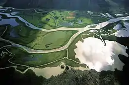The total area is about 9,400 square kilometres (3,600 sq mi), making it the world's largest unmodified nature area to be still cultured by natives—the natives in this case being the reindeer-herding Sami people.[2] Only parts of the area is actually used for pasture by them. With such a large space, the geography of the area varies greatly; it is dominated by mountains, rivers and lakes. Each nature reserve and national park has its distinctive features. The amount of snow in winter and rain in summer is considerable.