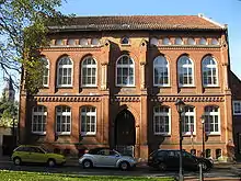 - The former Jewish school (building no. 21) was inaugurated in 1881. It was built of tiles in a neogothic style. The Jewish school, which was a public primary school, had 31 pupils in 1932 and 10 in 1939.[6] After the destruction of the synagogue in 1938, the school became the most important building in the Jewish community. In 1942 it was closed and converted into an orphanage.
