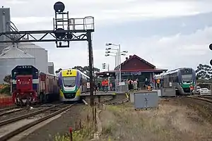 In 1973, a signal panel was provided at the station, and in 1981, it relocated into the station building.[1][3] It was abolished in January 2006.[5] No.2 road (loop siding) was also extended in 1973, providing a crossing loop.[1][3] The loop siding is generally used by trains serving the Avalon Airshow, which terminate at Lara.