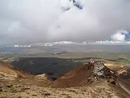 ![]() A view of Laram Quta (the largest lake) and Phaq'u Quta (in the distance) from the top of Chacaltaya. Chacaltaya refuge is on the right. | |