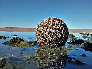 A lake ball (also known as a surf ball, beach ball or spill ball) is a ball of debris found on ocean beaches and lakes large enough to have wave action. The rolling motion of the waves gathers debris in the water and eventually will form the materials into a ball. The materials vary from year to year and from location to location depending on the debris the motion gathers.[1][2][3]