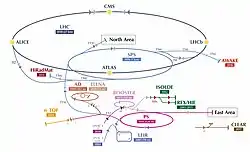 ![]() Plan of the LHC experiments and the preaccelerators. | |