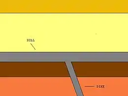 Dykes are typically sub-vertical to vertical. When upward flowing (dyke-forming) magma encounters horizontal boundaries or weaknesses, such as between layers in a sedimentary deposit, the magma can flow horizontally creating a sill. Some sill provinces have areal extents >1000 km.[19]